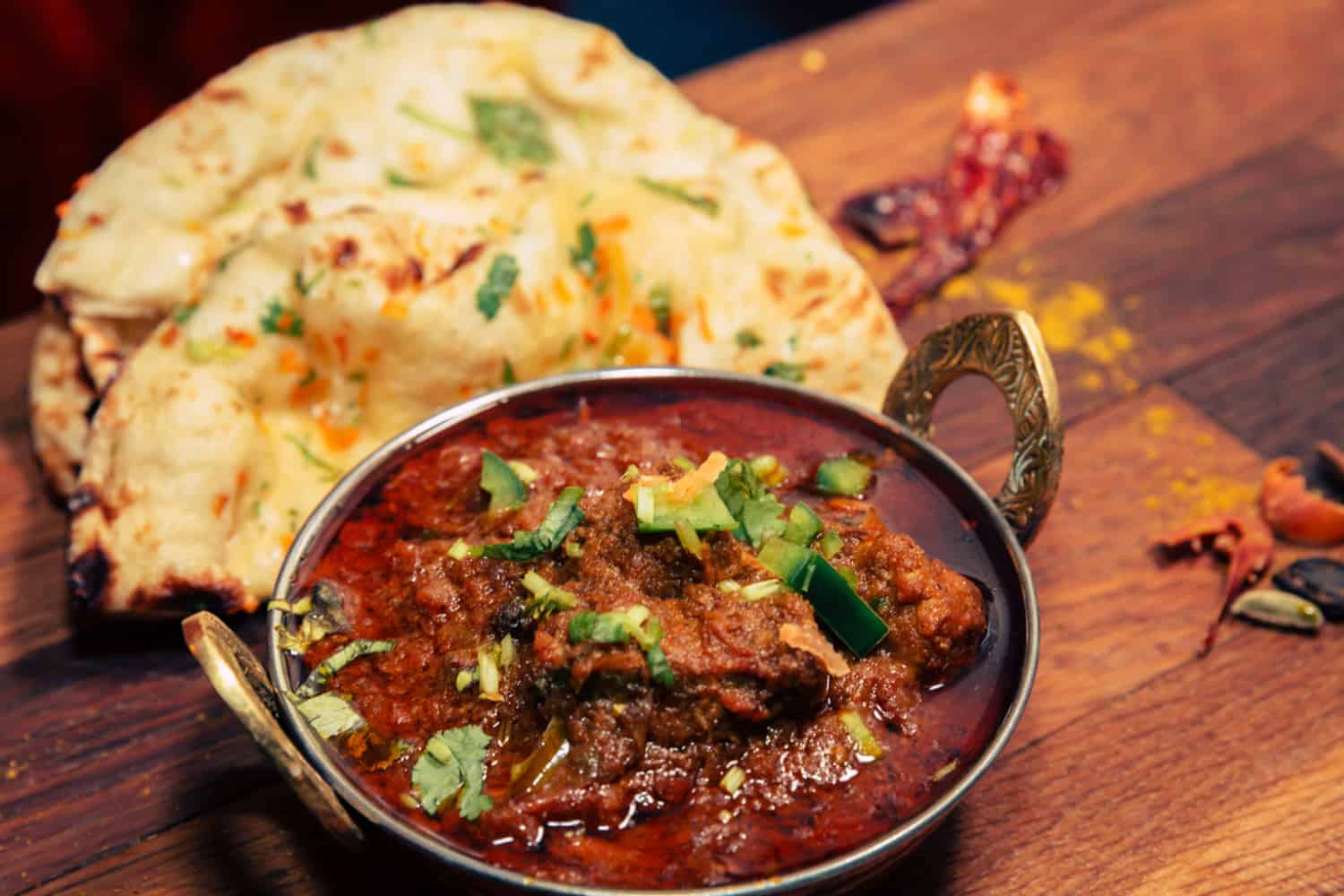 Lammaspaloja, perunaa, chiliä ja etikkaa erittäin tulisessa kastikkeessa.