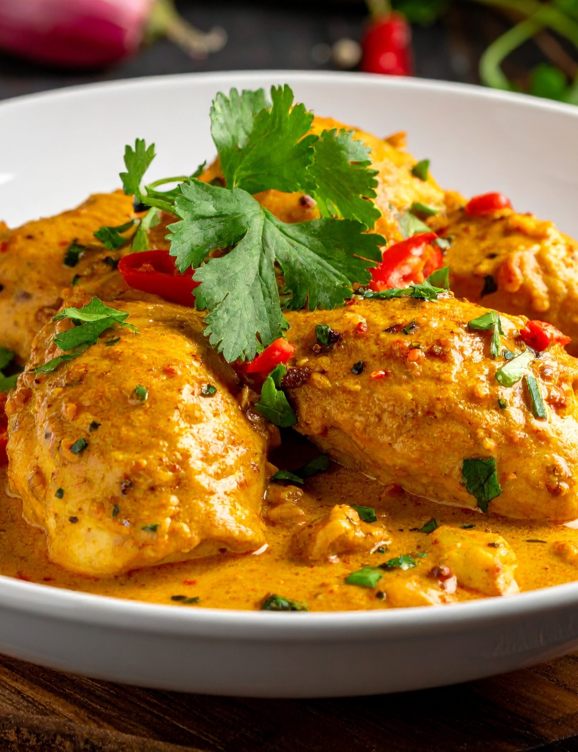 Mild chicken in a creamy coconut sauce.